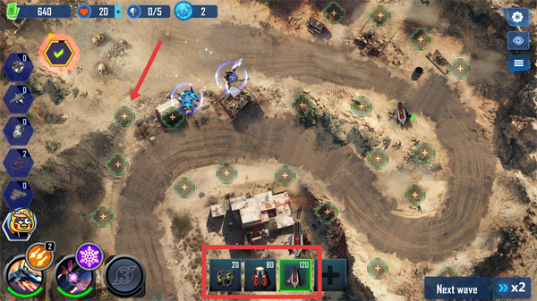 2、在关卡中选择合适的防御塔(如红色框内的各类塔),放置在地图的绿色加号点位上,构建防御阵线。