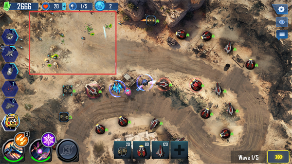 3、通过合理布局防御塔,消灭红色框内区域的敌人,阻止其通过路径,积累分数和资源。
