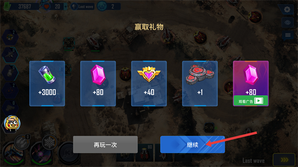 4、关卡胜利后,点击【继续】按钮,领取绿瓶、宝石等奖励,继续挑战后续关卡。