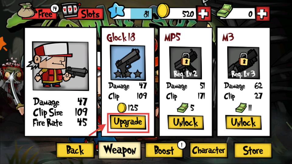 2、在武器界面,消耗【125】金币升级【Glock18】,提升伤害、弹夹等属性以增强战斗力。