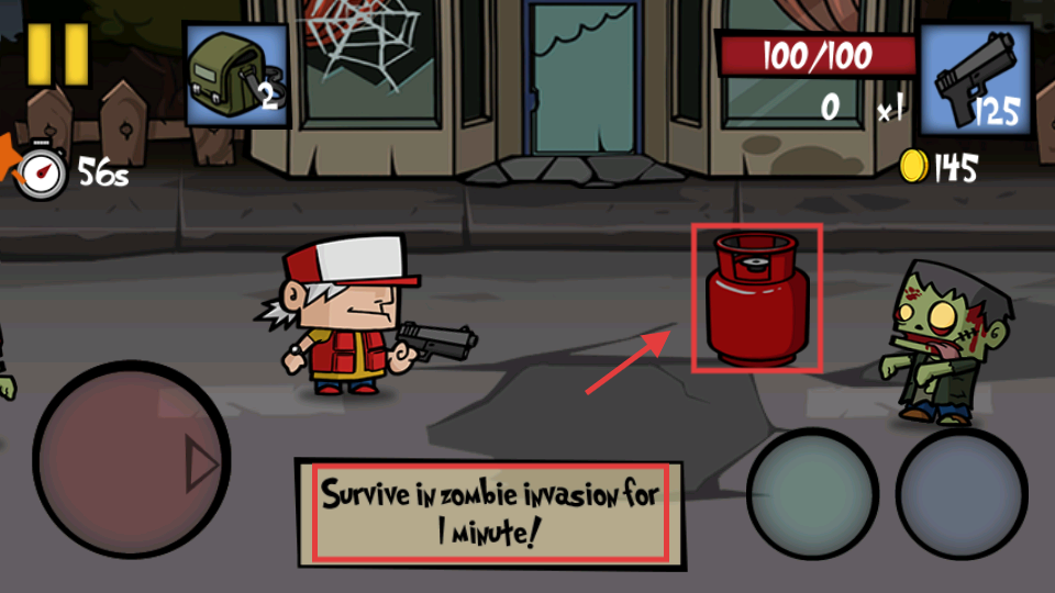 3、利用场景中的红色煤气罐,射击它引发爆炸,快速清理僵尸,完成“生存1分钟”的任务。