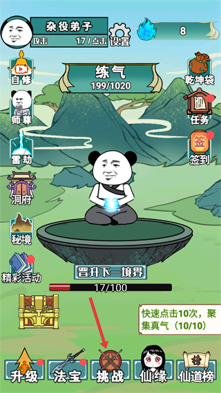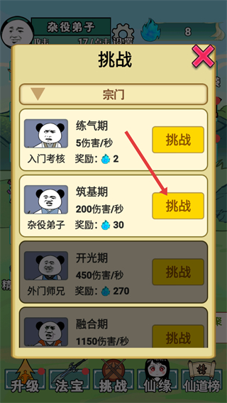 1、点击【挑战】按钮,进入挑战界面,准备参与宗门关卡挑战。
