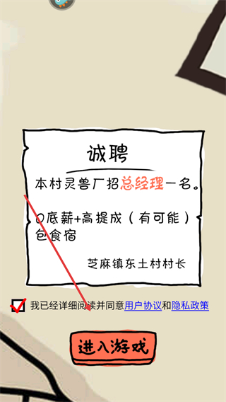 1、勾选同意用户协议和隐私政策后,点击【进入游戏】,成为灵兽厂总经理,开启经营之旅。
