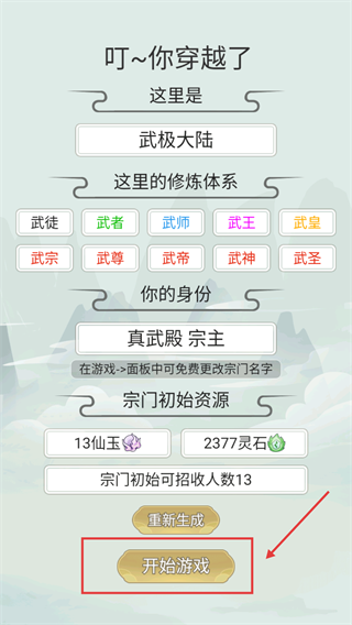1、确认初始资源【13仙玉】【2377灵石】,点击【开始游戏】按钮,开启真武殿宗门发展之旅。