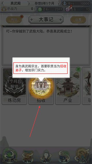 2、进入游戏后点击【招收】按钮,根据提示招收弟子,为宗门积累初始实力。