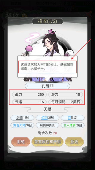 3、遇到属性差的弟子【孔芳菲】时,可点击【拒绝】,等待刷新更优属性的弟子。