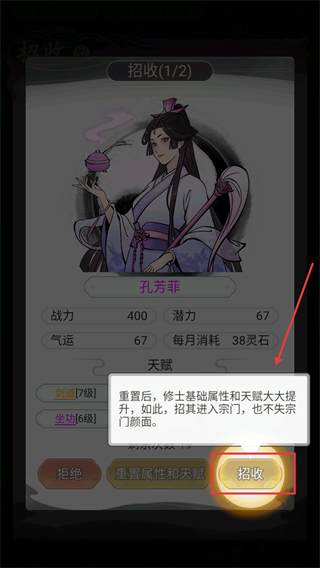 4、使用【重置属性和天赋】功能提升弟子【孔芳菲】属性,再点击【招收】增强宗门。