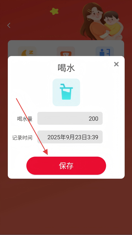 3、在喝水记录界面,设置喝水量等信息后,点击【保存】按钮。