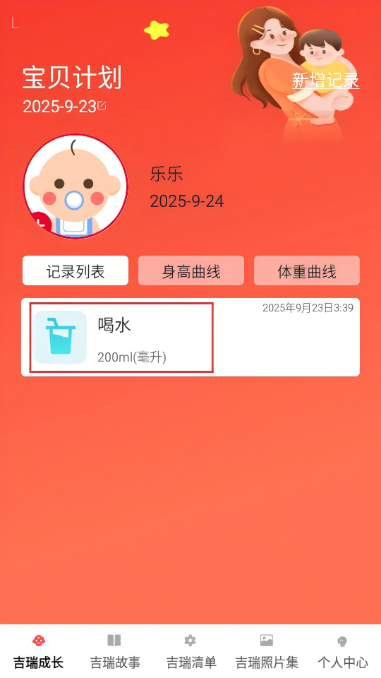 4、保存后,可在记录列表中查看宝宝的喝水记录等成长情况。