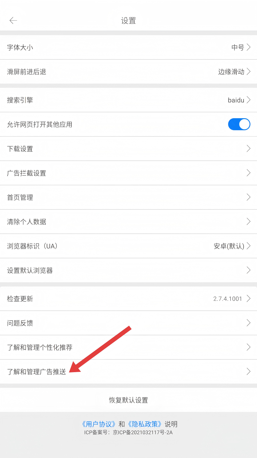 3、进入设置后,我们点击【了解和管理广告推送】,进入广告设置页面哦。
