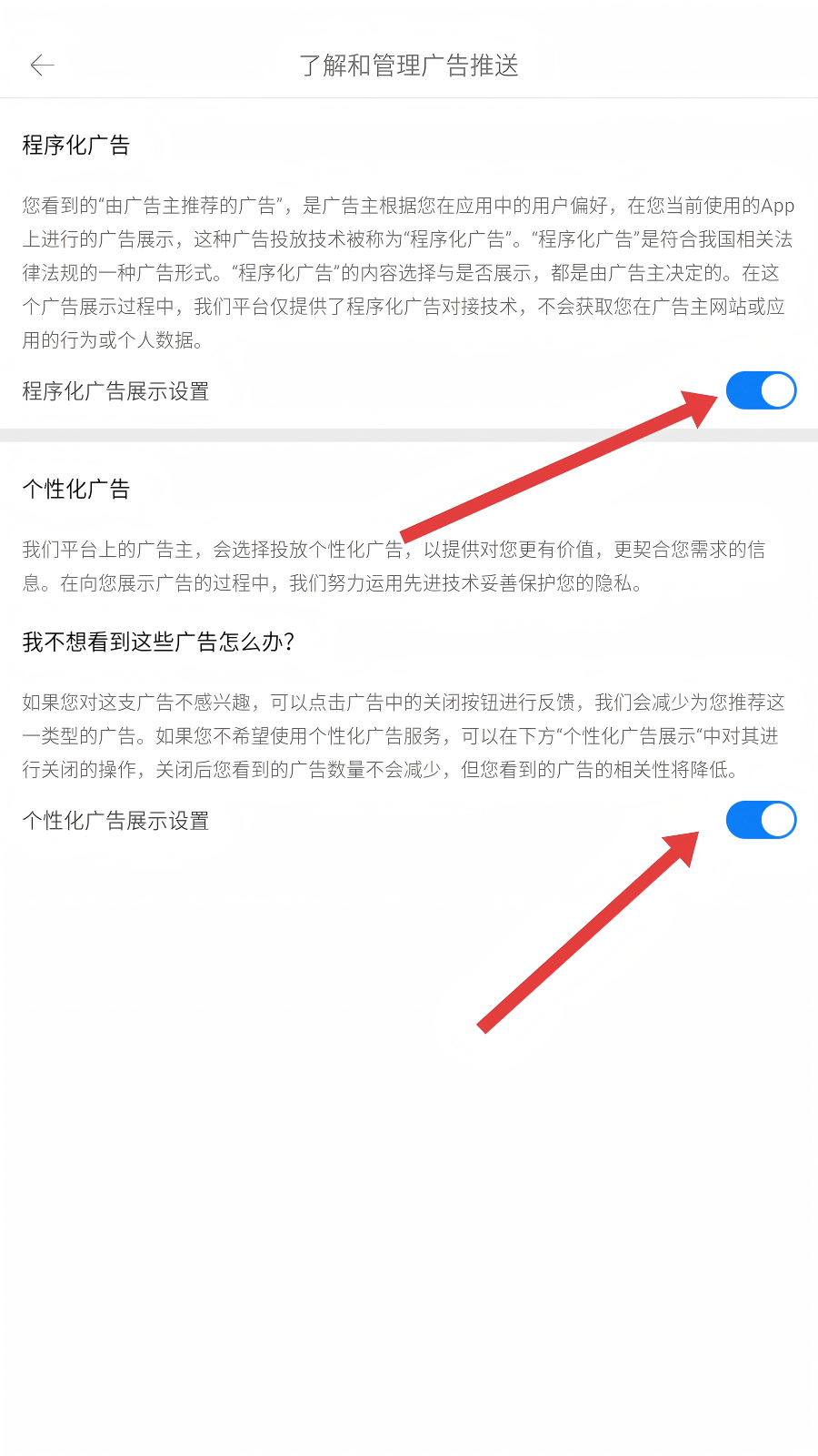 4、在广告推送页面,我们关闭【程序化广告展示设置】和【个性化广告展示设置】的开关,即可实现无广告浏览啦。
