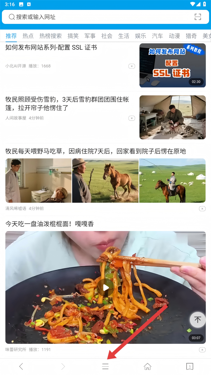 1、打开【久久浏览器】软件,点击下方三条横线的【菜单】,进行无广告设置的操作呢。