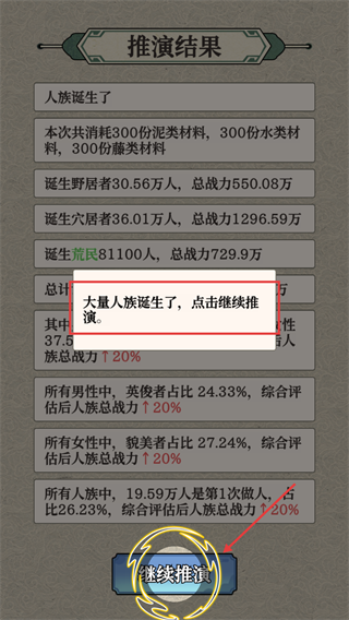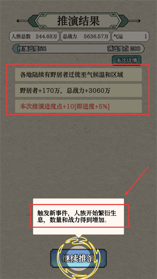 4、点击【继续推演】触发新事件,促使野居者迁徙提升人族数量与总战力。