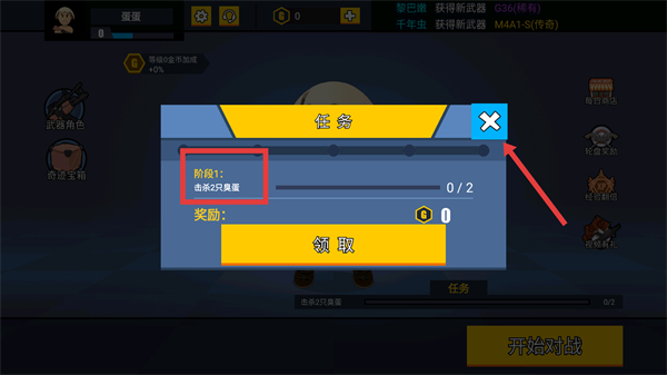 1、查看任务界面【阶段1-击杀2只臭蛋】,当前进度【0/2】,点击【打叉】关闭任务界面。