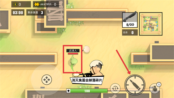 3、瞄准红框内的【武清人】目标,点击右侧武器按钮攻击,消灭后会掉落【碎片】道具。
