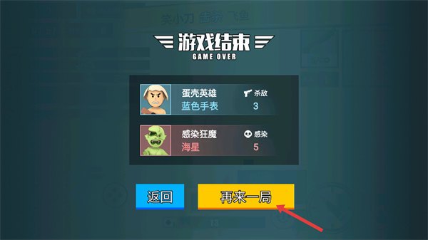 4、游戏结束后显示战绩,【蛋壳英雄-击杀-1】,点击【再来一局】可重新开启对战关卡。