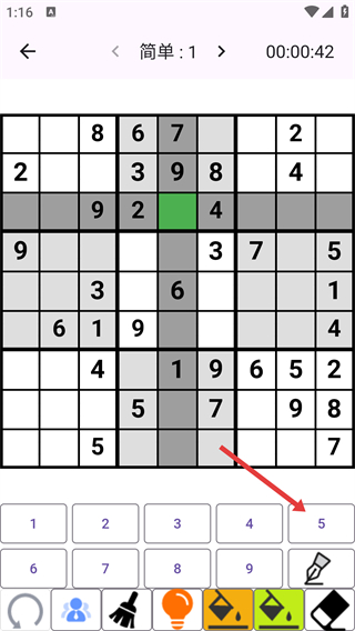 3、选中空格后,点击下方数字(如【5】)填充,需确保行列及宫格内数字不重复。
