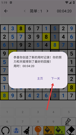 4、完成关卡后显示用时记录,点击【下一关】按钮进入新的数独关卡,继续挑战。