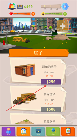 1、投资“简单的房子”,花费$250,每周成本$5根据资金状况和策略选择是否投资,助力资产建设。