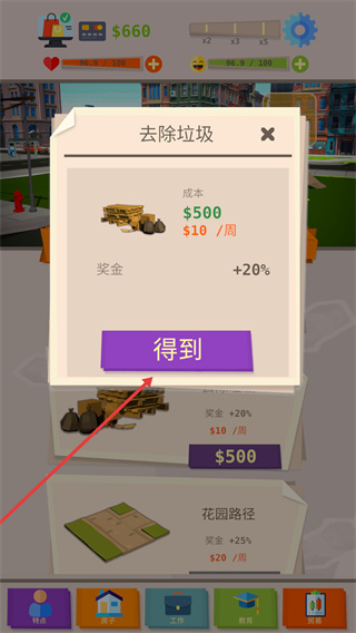 2、选择“去除垃圾”项目,花费$500,每周成本$10,可获得奖金+20%的效果,提升资金积累和收益能力。