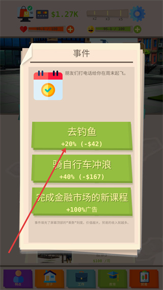 3、参与“去钓鱼”事件,可获得+20%的效果,花费$42,根据游戏策略选择是否参与,以优化角色发展和资金状况。