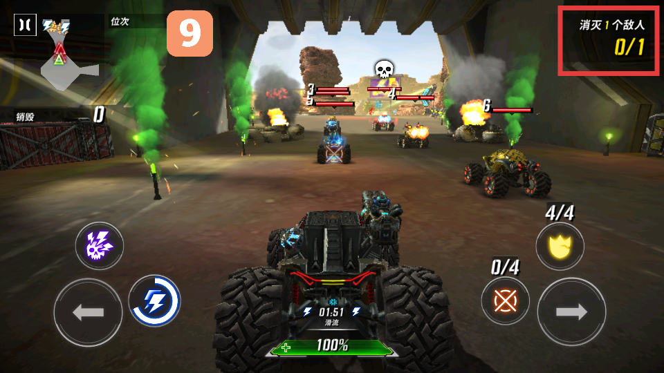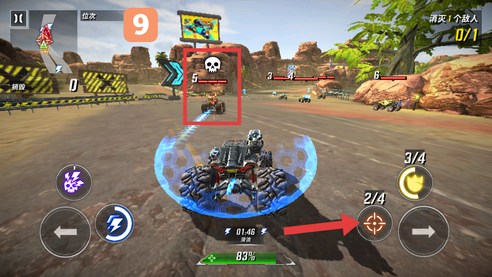 3、利用右侧的瞄准按钮锁定敌人(如带有骷髅标识的赛车),发射武器消灭敌人,完成任务目标。