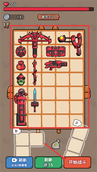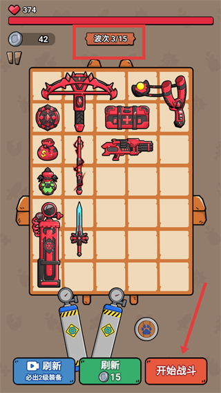 1、在战斗准备界面,搭配红色框内的各类武器、道具后,点击【开始战斗】进入游戏。