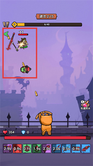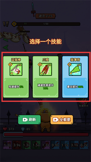 3、升级时会出现技能选择界面,在红色框内选择心仪的技能(如提升攻速、减速效果、暴击率等),增强战斗能力。