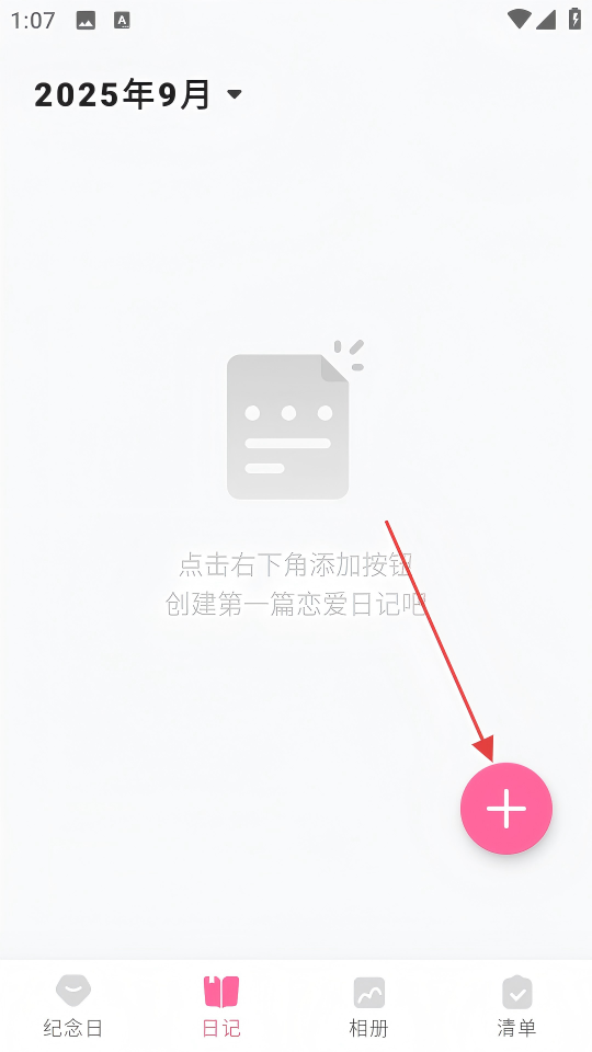 2、在日记界面,点击右下角粉色“+”按钮,进入日记编辑页。