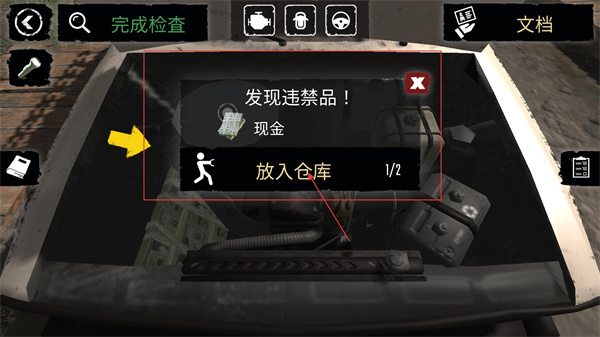 3、检查中发现【违禁品-现金】时,点击【放入仓库-1/2】完成物品收缴,这是任务进度推进的核心步骤之一。