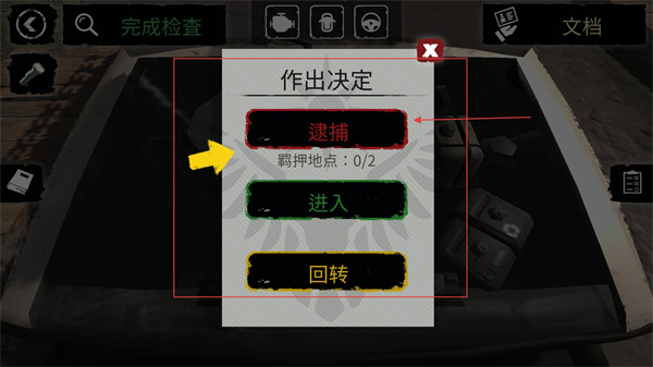 4、完成违禁品处理后,在【作出决定】界面选择对应操作(如【逮捕】),结合【羁押地点-0/2】进度,完成本次检查的收尾流程。