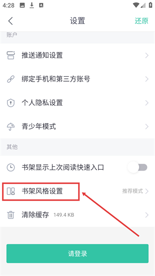 3、在【设置】页的【其他】板块,找到【书架风格设置】选项,点击进入对应的设置弹窗。