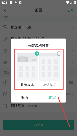 4、在【书架风格设置】弹窗里,选择目标风格(如【简洁模式】)后,点击【确定】按钮完成设置。
