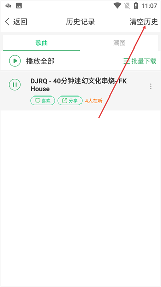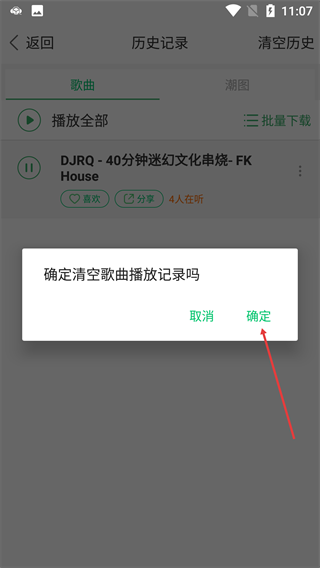 3、点击右上角【清空历史】按钮,触发“确定清空歌曲播放记录吗”的确认弹窗。