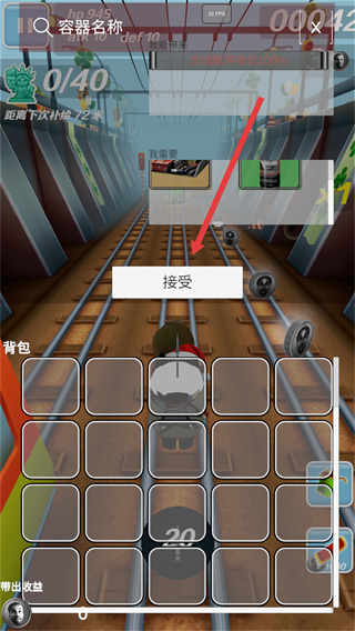 4、在道具窗口中点击接受按钮,将获取的道具存入背包,继续进行跑酷挑战。