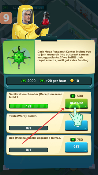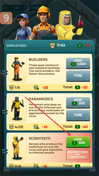 1、在员工界面可雇佣【SCIENTISTS】,花费【500】资源解锁,其负责研发病毒药物、治疗感染者,是防控核心人员之一。