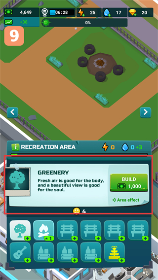 4、在休闲区域花费【1,000】资源建造【GREENERY】,其可提供新鲜空气与景观,提升区域效果以辅助防疫。