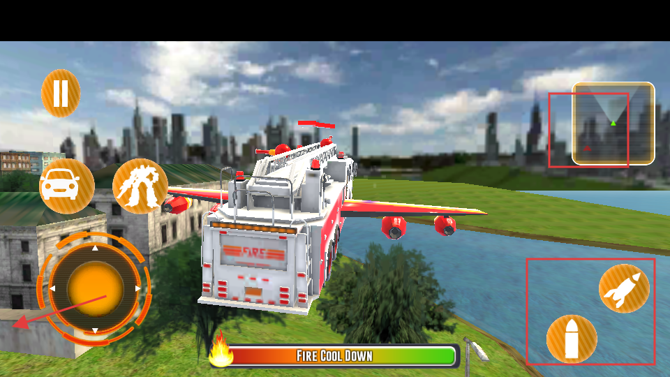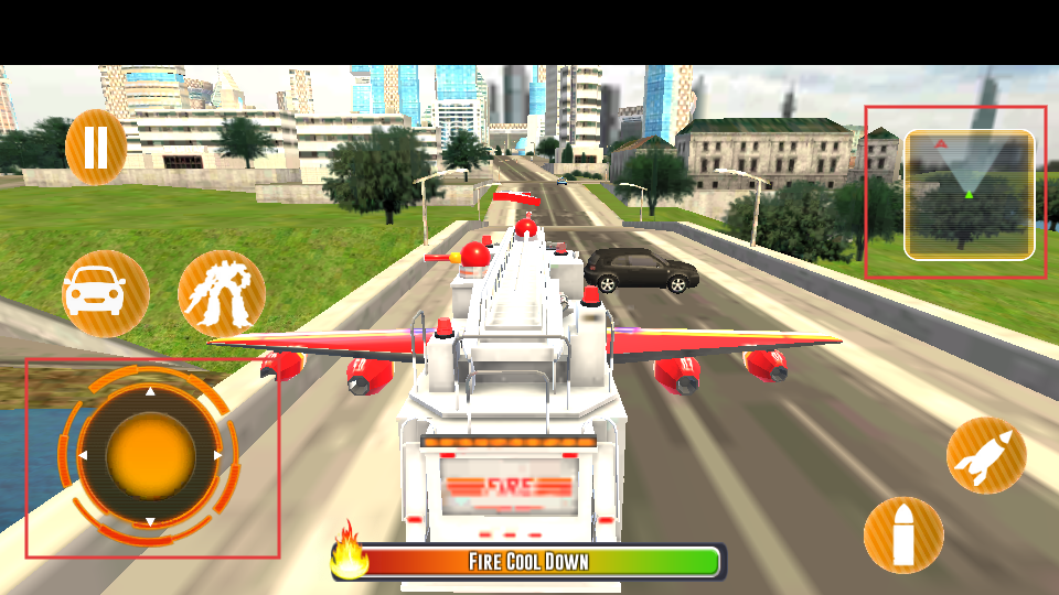 3、通过左侧的虚拟摇杆控制飞行消防车的移动方向,右侧的雷达辅助定位目标位置,执行救援任务。
