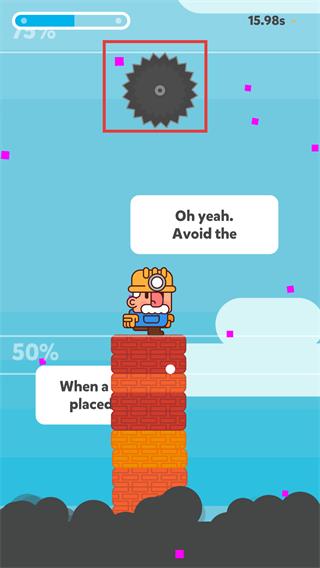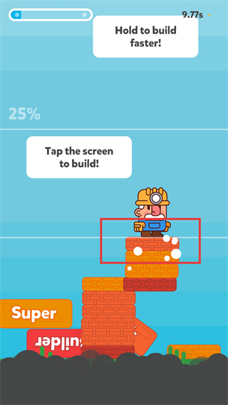 2、游戏中点击屏幕来砌砖,长按屏幕可以加快砌砖速度,让角色站在砌好的砖块上不断向上搭建。