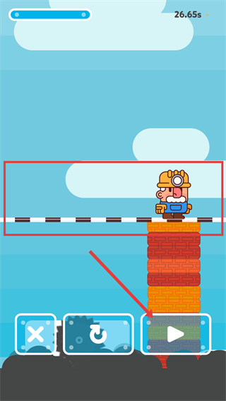 4、当角色到达目标高度区域(红色框内的黑白条纹区域)时,点击下方的播放按钮,完成关卡挑战。