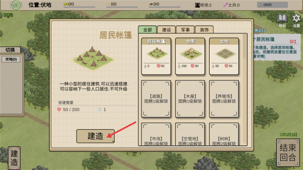 2、在建造界面选【居民帐篷】,点击【建造】,推进部落的居民设施建设。