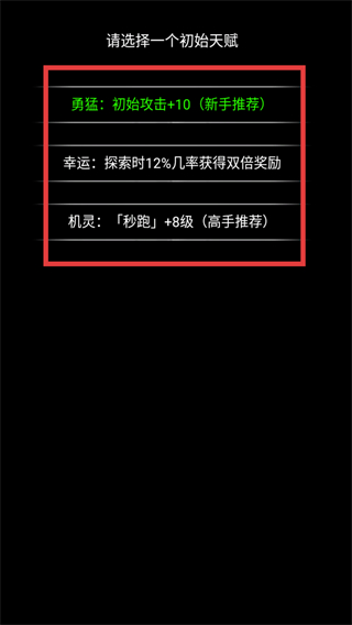 1、开局选择初始天赋:新手选【勇猛-初始攻击+10】,高手选【机灵-“秒跑”+8级】,也可选【幸运-探索时12%几率得双倍奖励】。