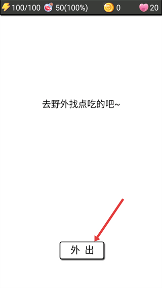 2、界面显示【100/100】状态值时,点击下方【外出】按钮,前往野外获取食物,推进游戏进程。