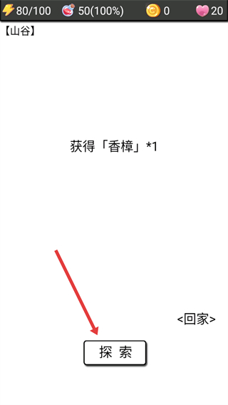 3、进入【山谷】后点击【探索】,可获得物资如【香樟*1】,同时注意自身状态值的消耗变化。