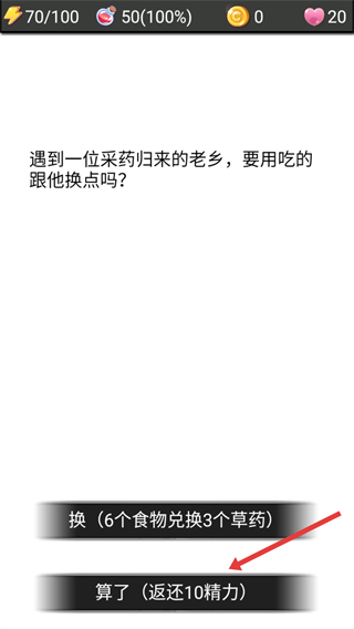 4、遇到老乡时,点击选择【算了-返还10精力】保留物资。