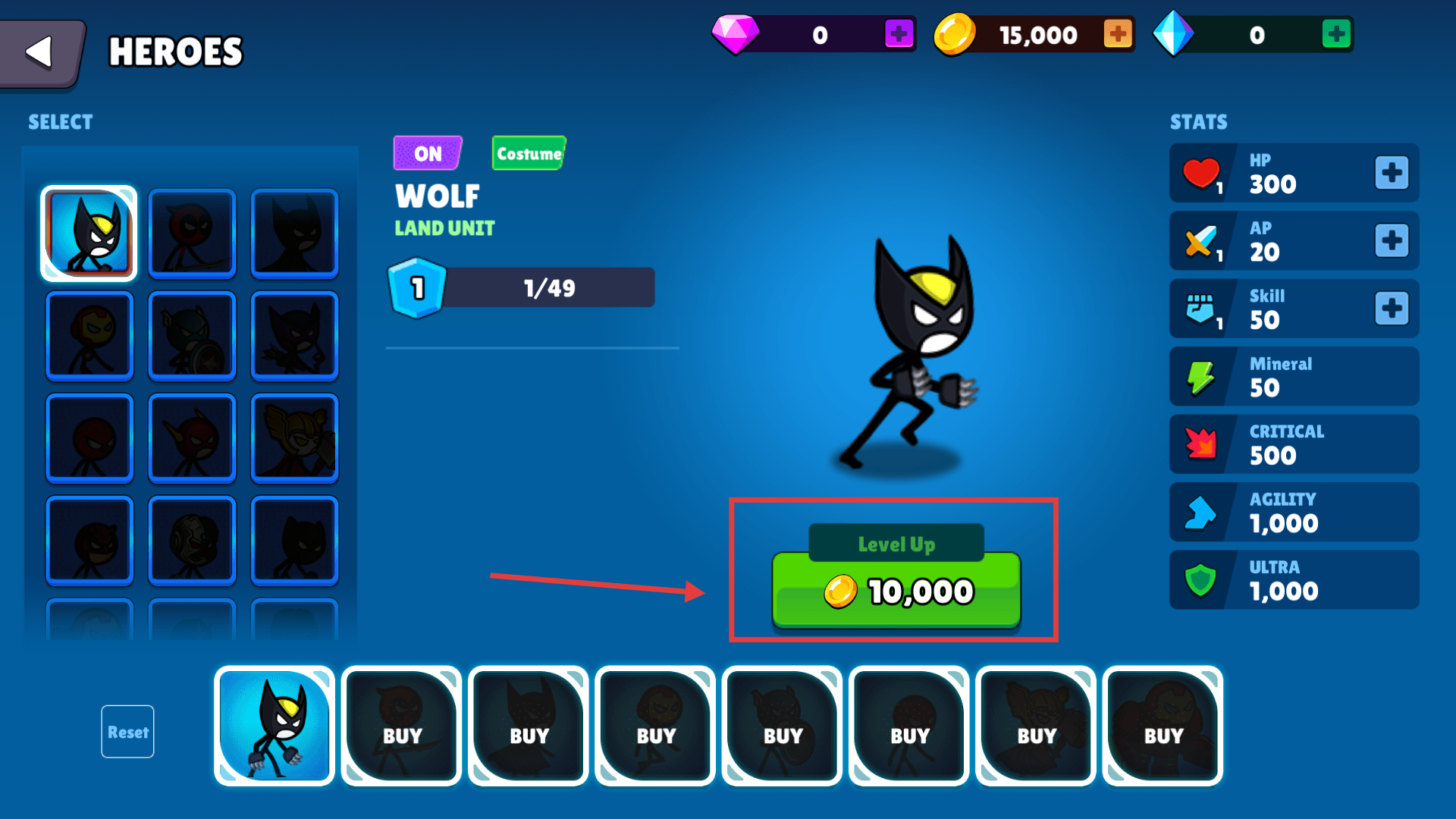 2、在英雄界面选择【WOLF】,消耗【10000】金币点击升级按钮,提升其属性增强战斗能力。