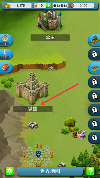 1、点击红色箭头指向的【城堡】区域,进入城堡界面查看任务和升级选项。