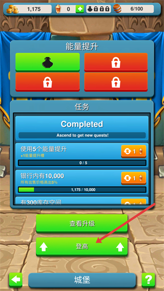 2、在城堡界面中,点击红色箭头指向的【登高】按钮,触发任务完成后的提升流程。