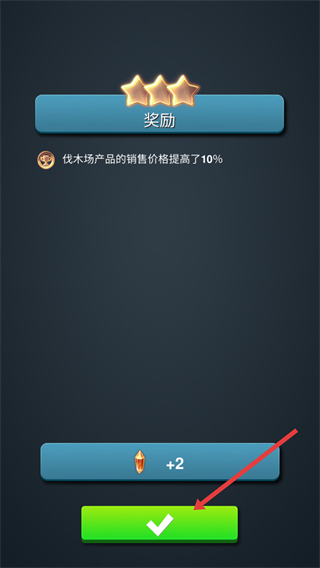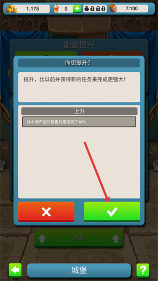 3、在提升确认界面,点击红色箭头指向的绿色对勾按钮,确认提升操作,获得伐木场产品销售价格提高的奖励。