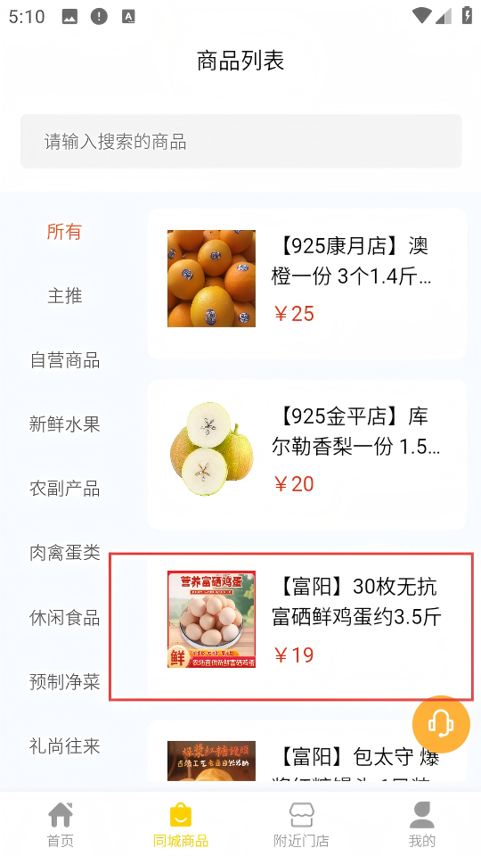 2、点击底部【同城商品】,进入商品列表页面,能看到各类商品及分类选项。
